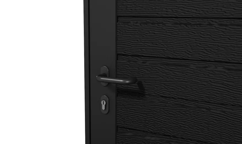Боковые двери изготавливаются из тех же панелей, что и ворота. Благодаря этому они гармонично сочетаются между собой, а фасад гаража приобретает завершенный вид.