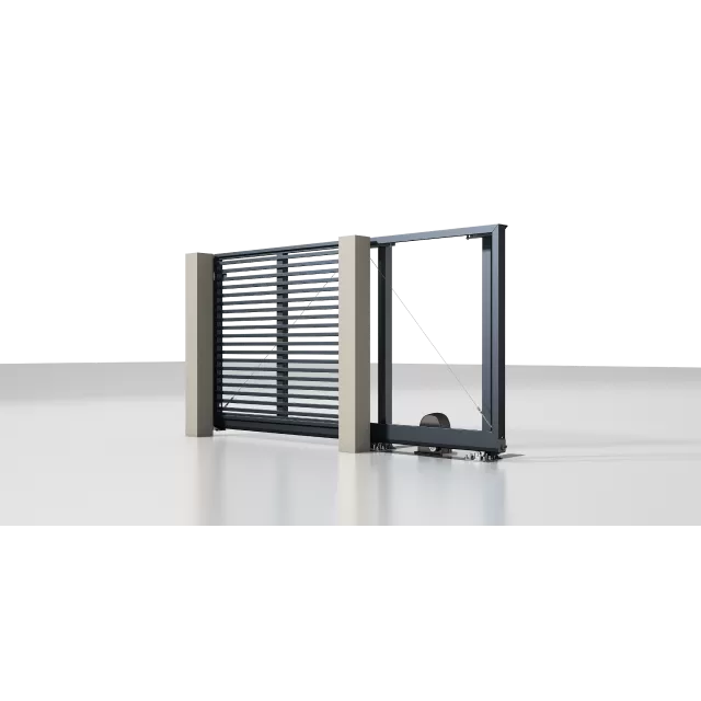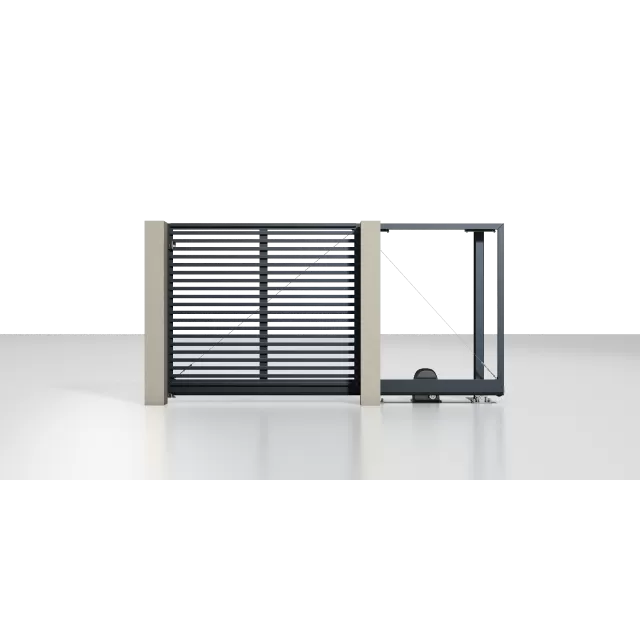Рама: 96 мм. Комбинированное заполнение: сэндвич-панель L-гофр и разреженный профиль 37 мм. цвета «Серый антрацит» (RAL 7016). Автоматика ALUTECH Roteo